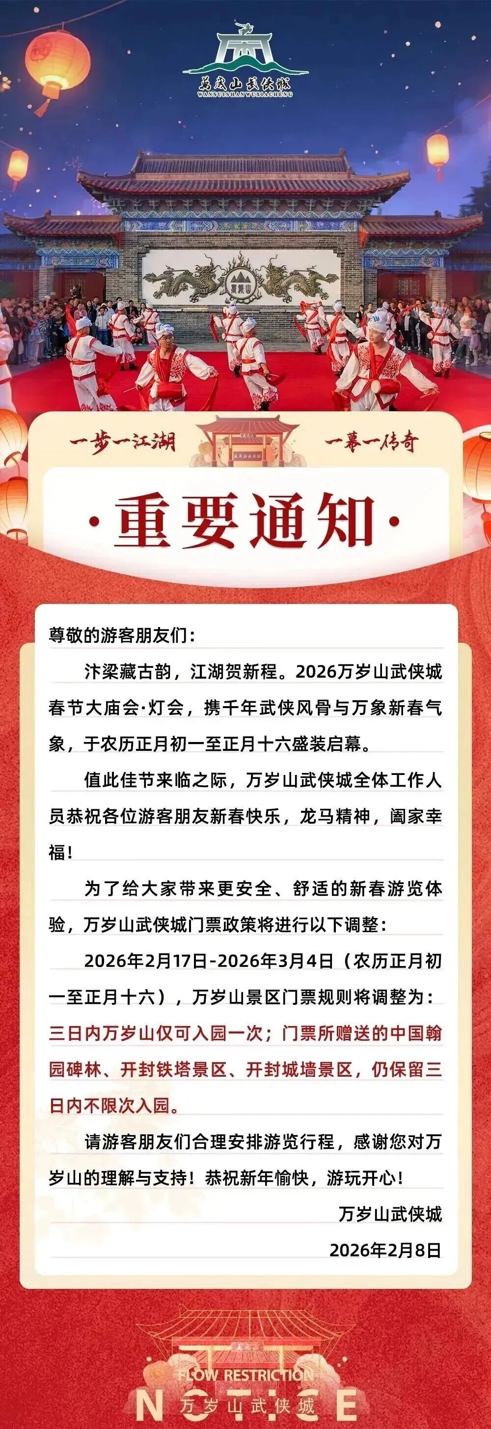 2月8日,开封万岁山武侠城发布调整门票政策通知:2026年2月17日-2026年3月4日(农历正月初一至正月十六),万岁山景区门票规则将调整为三日内万岁山仅可入园一次;门票所赠送的中国翰园碑林、开封铁塔景区、开封城墙景区,仍保留三日内不限次入园。