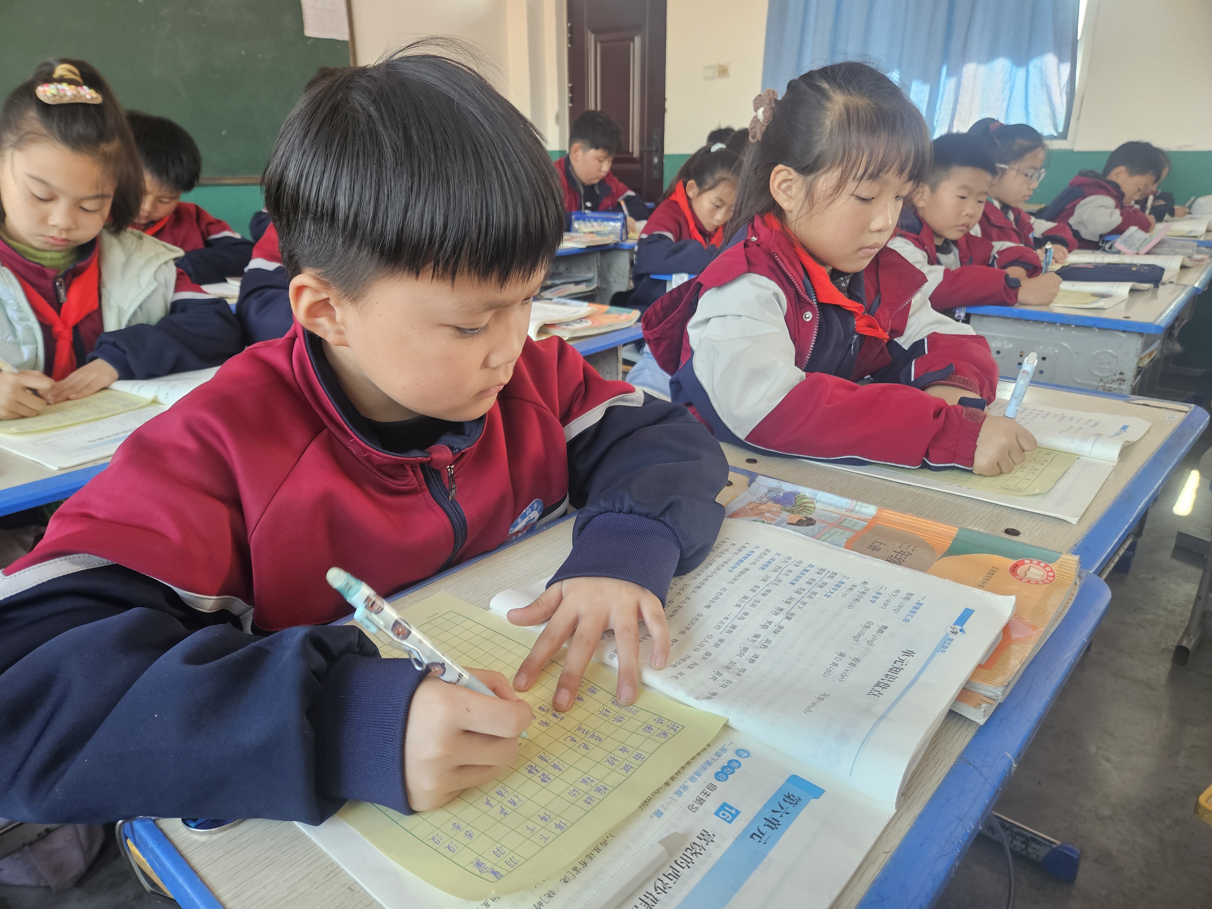 午后,学生们铺开习字本,在老师的指导下临摹汉字。该校将书法练习融入午后20分钟,从基本笔画到经典名句书写,既提升书写能力,也让传统文化在笔墨间自然渗透。