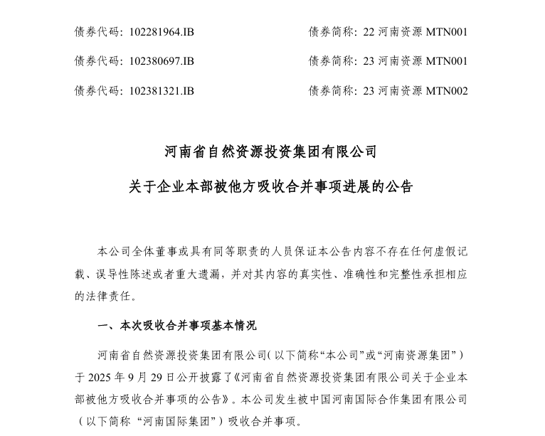 此前,9月29日,河南资源集团曾发布公告,根据河南省政府国资委于2025年9月出具的《省政府国资委关于中国河南国际合作集团河南省自然资源投资集团实施联合重组的批复》(豫国资文〔2025〕79号),同意河南国际集团吸收合并河南资源集团。