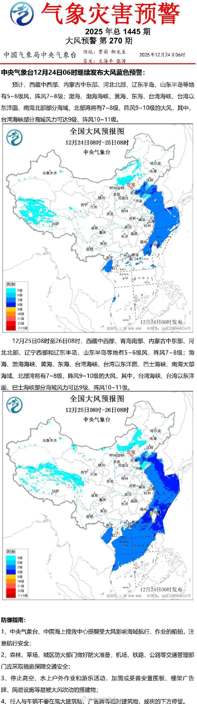 中央气象台12月24日06时继续发布大风蓝色预警。