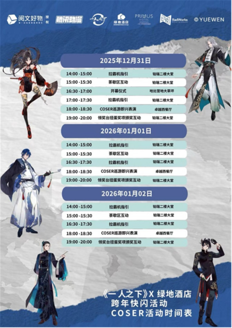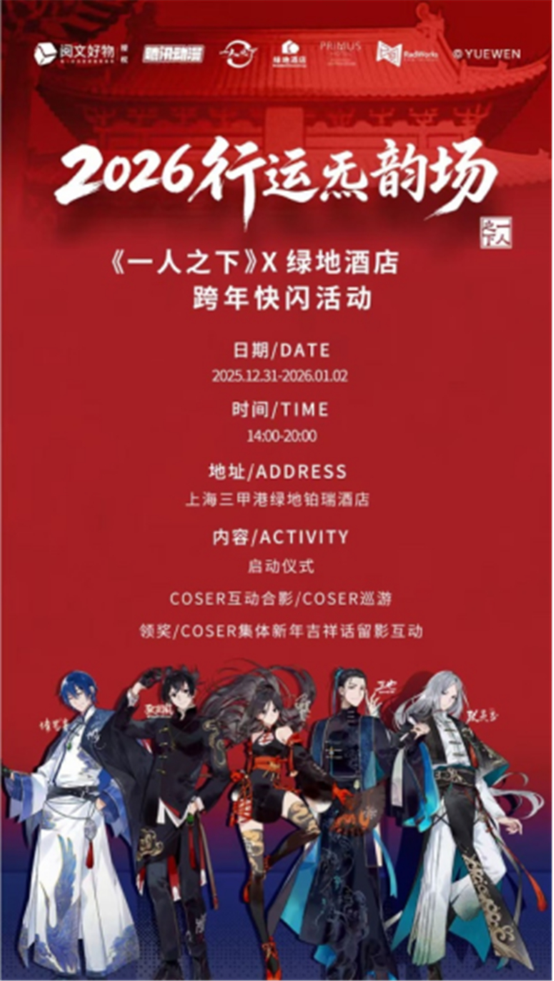 双方围绕“国漫IP+酒店”场景融合、2026跨年“行运炁韵场”活动落地、长期合作模式等核心议题展开深入交流,达成多项共识,正式确认将于2025年12月31日至2026年1月3日推出《一人之下》主题嘉年华活动,为上海跨年元旦假期打造国漫娱乐新地标,且该延展活动将持续至2026年2月28日,让更多消费者在迎新年之际感受国漫与微度假结合的独特魅力。