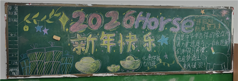 从小学部的童真童趣到初中部的意气风发,各班黑板报主题鲜明、创意纷呈。有的以“贺元旦 迎新年”“喜迎元旦 展望新年”为核心,搭配金鱼、灯笼、梅花等传统吉祥图案,笔触稚嫩却满是新年的欢喜;有的融入元旦由来、王安石《元日》等传统文化知识,在趣味创作中传递节日内涵;初中班级则结合2026马年元素,写下“如骏马奔腾,在追梦路上乘风破浪”的励志话语,将青春理想与新年祝福相融。色彩斑斓的粉笔画、工整的文字排版、独具匠心的版面设计,让每一块黑板报都成为班级特色与新年氛围的融合之作。
