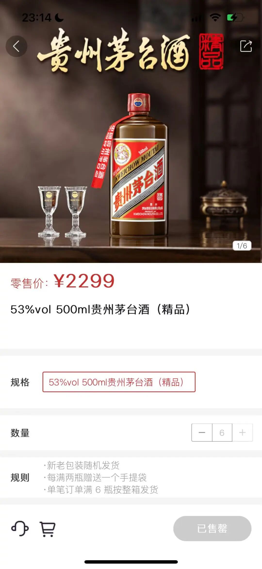 1月9日开始,每日09:09起可登录i茅台APP,点击“i购”板块购买53%vol 500ml贵州茅台酒(精品),同一用户每日至多可购买6瓶,当日投放售完即止。
