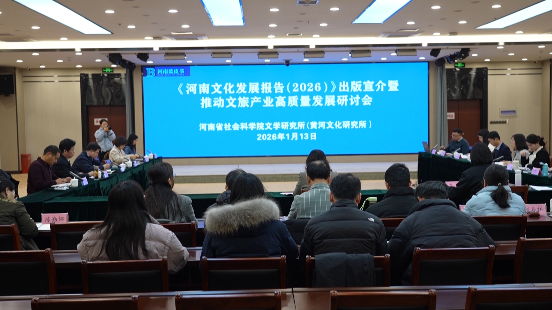 2026年1月13日上午,由河南省社会科学院主办的《河南文化发展报告(2026)》出版宣介暨“推动文旅产业高质量发展”研讨会在郑州举行。座谈会全面学习贯彻党的二十届四中全会精神,围绕聚焦河南“1+2+4+N”目标任务体系,就着力推动文化繁荣兴盛,加强推进文旅强省建设,实现文旅高质量发展,开展深入研讨。河南省社会科学院副院长、《河南文化发展报告》主编王玲杰研究员出席会议并致辞。来自河南省委宣传部、郑州大学、华北水利水电大学、河南财经政法大学、郑州市黄帝文化研究中心等单位的专家学者与主创团队成员,以及多家新闻媒体记者参加了本次研讨会。座谈会共分为出版发布和学术研讨两个环节。会议由河南省社会科学院文学研究所(黄河文化研究所)所长李娟研究员主持。