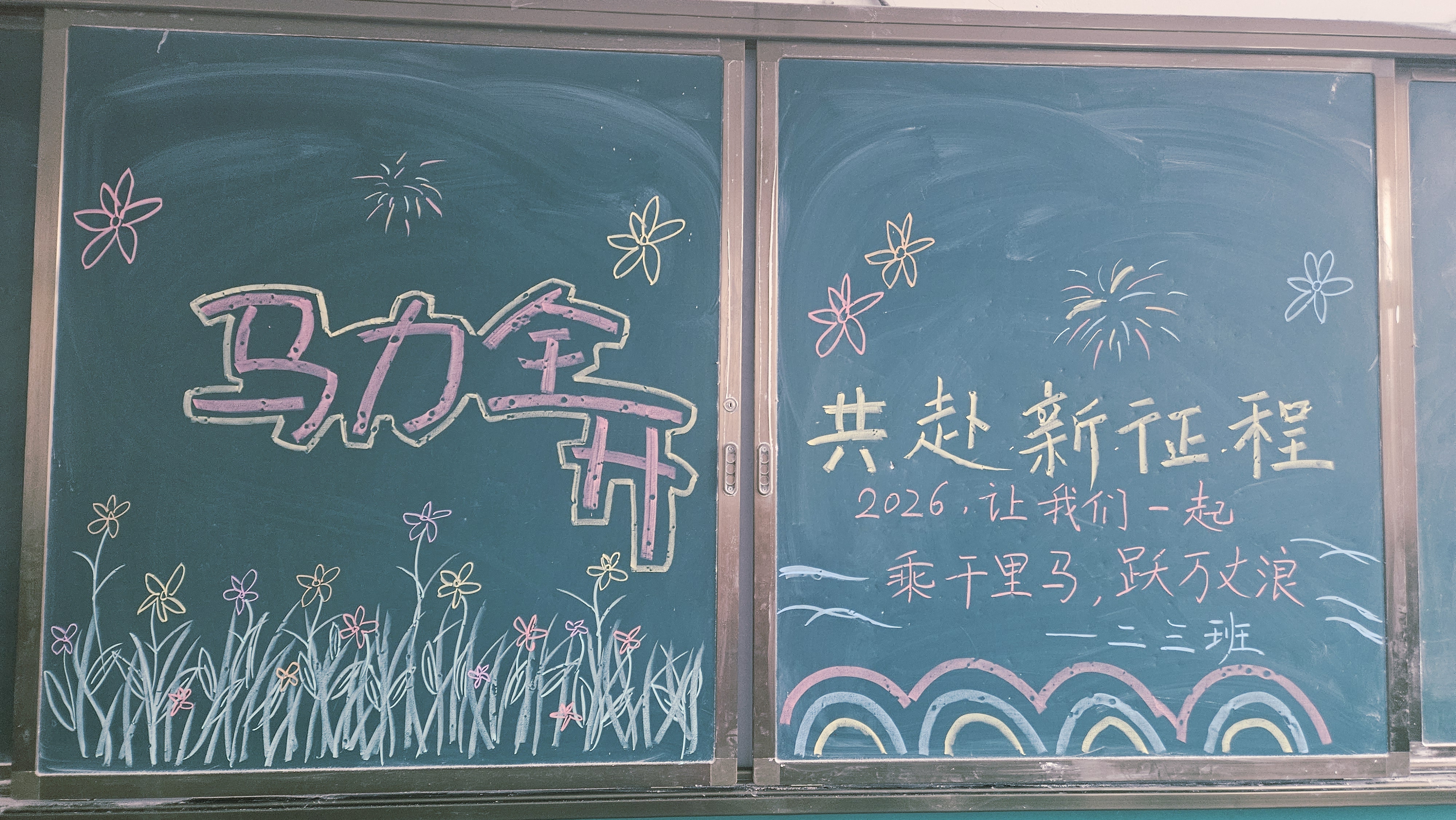 与此同时,各班班主任和美术老师们精心构思、妙笔生花,在黑板上创作出一幅幅主题鲜明、充满活力的黑板报。“马力全开 共赴新征程”“一马当先 奔跑吧少年”“我们开学啦”等内容,既融入了马年的美好寓意,又传递了对新学期的无限期许,为教室增添了浓厚的文化氛围和青春气息。