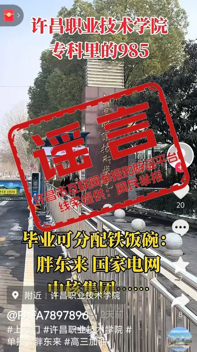 2月3日,抖音账号“FAFA7897896”发布视频称“许昌职业技术学院——专科里的985,毕业可分配铁饭碗:胖东来、国家电网、中核集团……”。经向许昌职业技术学院核实,学校不存在包分配的情况,网传内容系不实信息。目前,相关视频已删除,公安机关依法对账号持有人予以批评教育。