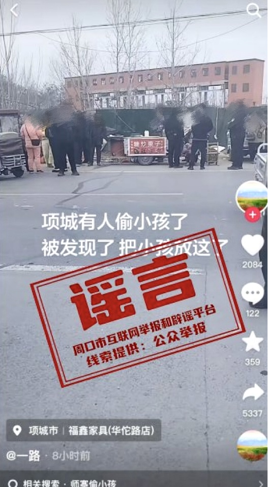 2月9日,抖音账号“一路”发布视频称“项城有人偷小孩被发现,放到这了”,引发网民关注转发。经项城市委网信办与公安机关联合调查,当日,该市郑郭镇一幼儿走失,家属报警后已被辖区民警及时找回,网传“偷小孩”信息不实。经查,账号持有人赵某某为吸引关注,在明知真相的情况下,故意编造虚假信息在网上传播。目前,公安机关已依法对赵某某予以行政拘留5日的行政处罚。