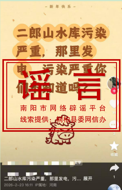 2月23日,抖音账号“用户18**老白”发布视频称“桐柏县二郎山水库因发电导致水库污染严重”,引发网友关注讨论。经属地政府、水利、生态环境等相关部门联合调查,二郎山水库属于中型水库,以防洪、灌溉为核心,未承担发电工作,周边无污染问题,网传内容系不实信息。目前,该信息已删除,桐柏县网信办联合公安、水利、生态环境等部门及属地乡镇依规对账号主体白某某进行约谈。