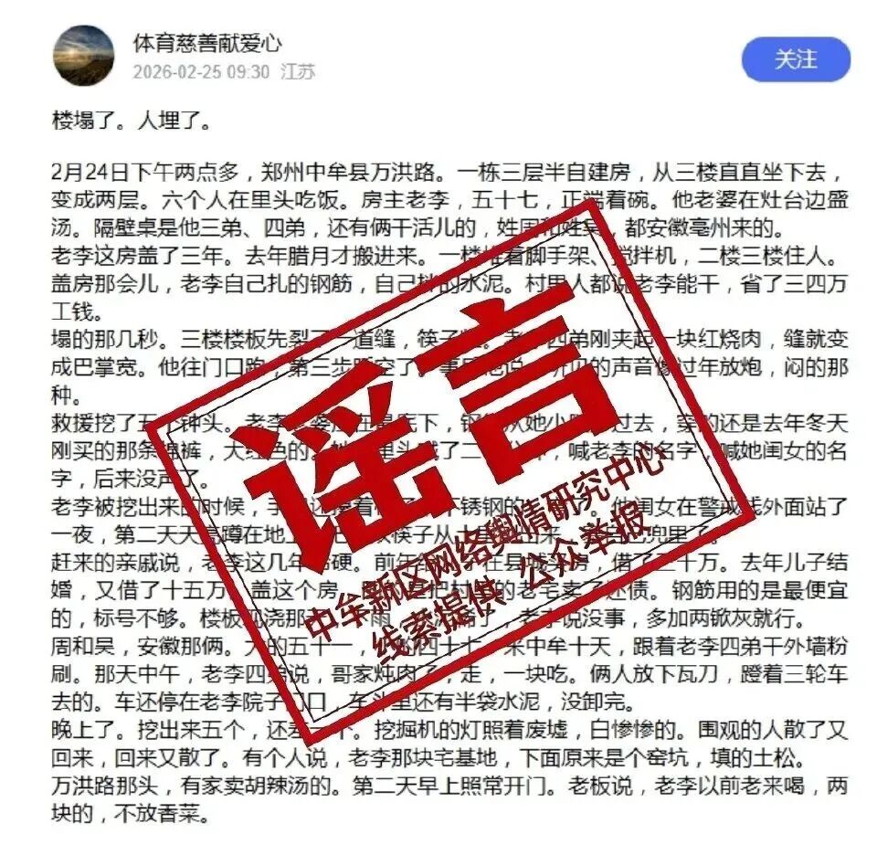 2月25日,郑州市委网信办监测发现,百家号账号“体育慈善献爱心”发文称“郑州中牟县万洪路一自建房倒塌,多人被埋”,引发网民关注。经向中牟新区相关部门核实,该信息系不实信息。经郑州市网信、公安部门联合调查,该账号实际运营者为重庆某传媒公司员工廖某某,其为提升账号热度故意编造传播该虚假信息。目前,相关内容已删除,公安机关依法对廖某某予以行政拘留5日并处罚款1000元的行政处罚。