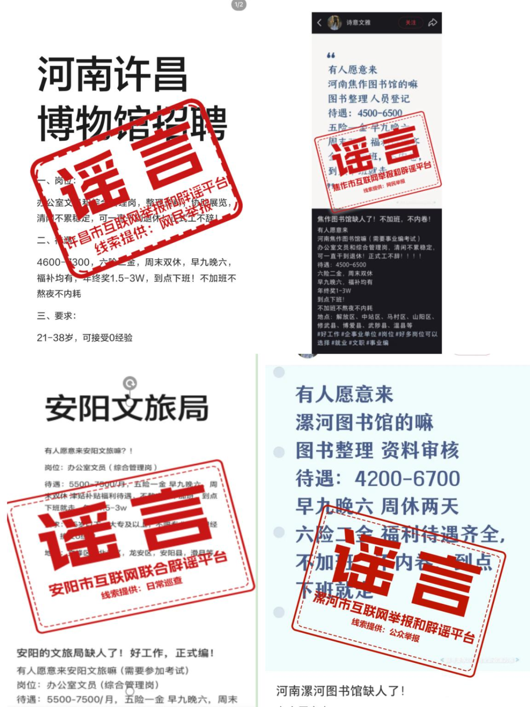 2月,网上出现“安阳文旅局、许昌博物馆、漯河图书馆”等多个单位虚假招聘信息,引发网民关注。我省属地网信部门发挥网络辟谣联动机制作用,及时发布权威辟谣信息回应关切,有效阻断谣言传播链条。在此提醒广大求职人员,切勿轻信非正规渠道发布的招聘信息,谨防财产损失或个人信息泄露。(来源:安阳、焦作、许昌、漯河市委网信办)